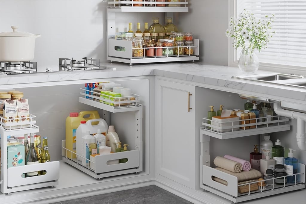A simple two-tier under-sink organizer can turn that awkward cabinet into practical storage for cleaning supplies and everyday essentials.