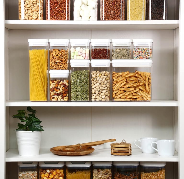 For dry goods and leftovers, stackable airtight food containers create visual calm while saving space. Clear containers also help you see what you have, reducing food waste and unnecessary purchases.